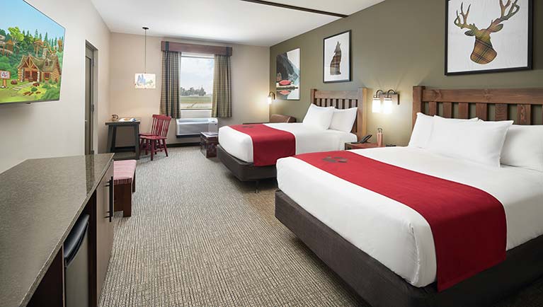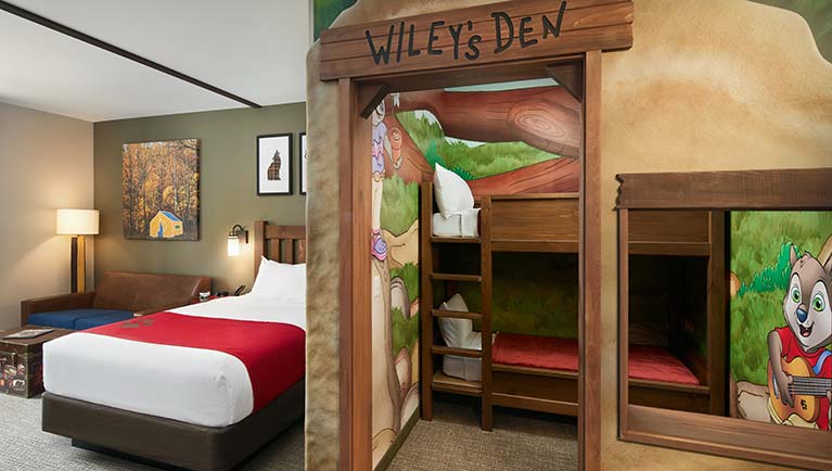 Suite featuring a Northwoods-themed sleeping area with bunk beds and a queen bed. Sleeps up to 6 guests.